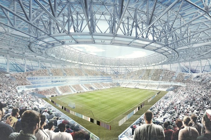 Още една виртуална илюстрация. Стадионът (за 44 899 зрители) трябваше да бъде завършен в края на тази година, но това ще стане в началото на следващата. Възникнаха проблеми при строителството, а през октомври горя и пожар (долу).