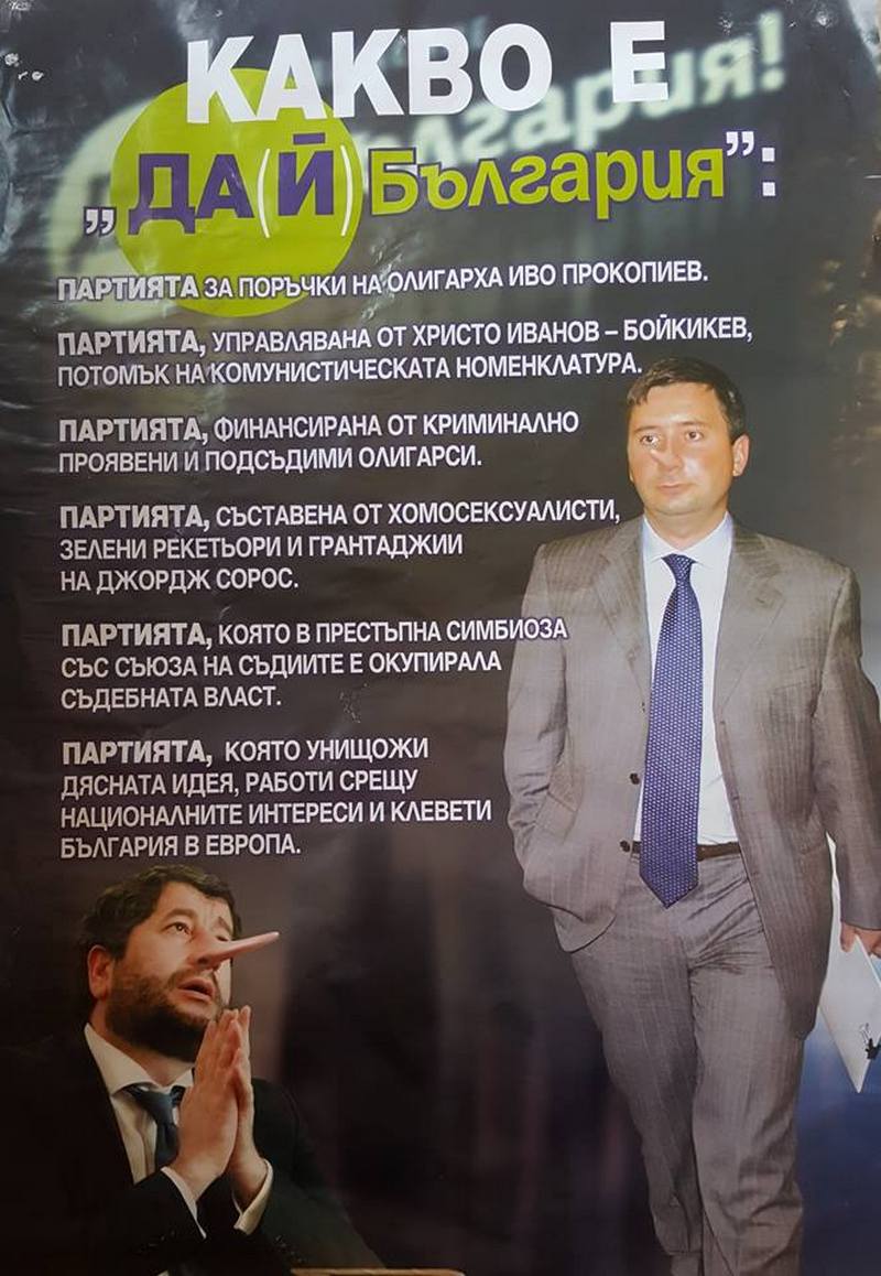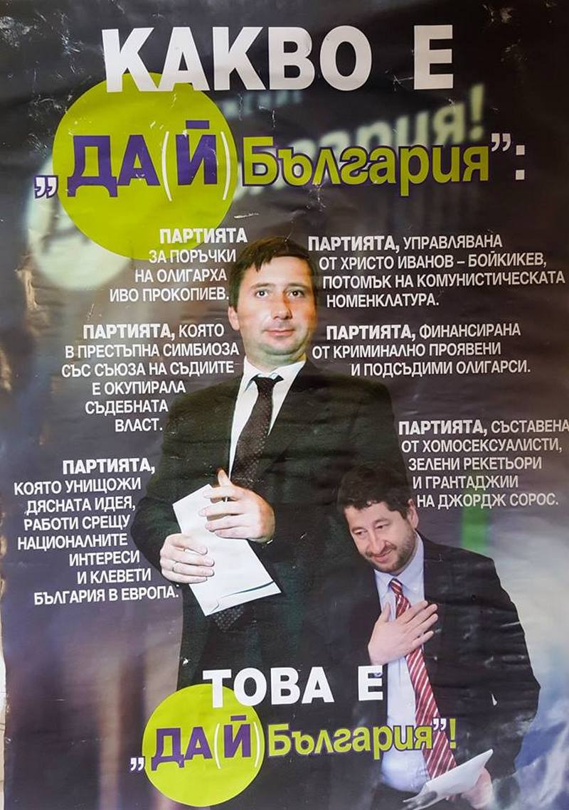 Плакати срещу Движение "Да, България" се появиха днес в София. На тях името на партията е изписано по "любимия" на т. нар. медии от корпулентния кръг начин - "Дай България". Според анонимния автор на плаката партията е съставена от "хомосексуалисти, зелени рекетьори и грантаджии на Джордж Сорос.