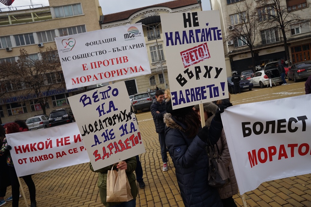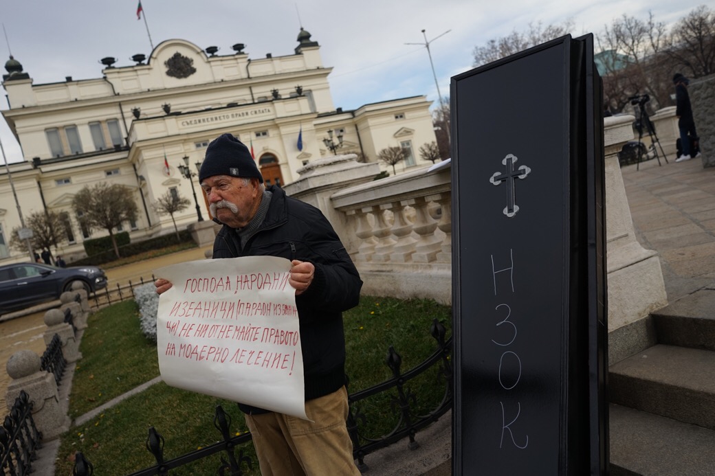 С тези и подобни плакати пред Народото събрание се събраха протестиращи срещу едногодишния мораториум върху новите лекарства и терапии, въведен в Бюджет 2018 г.