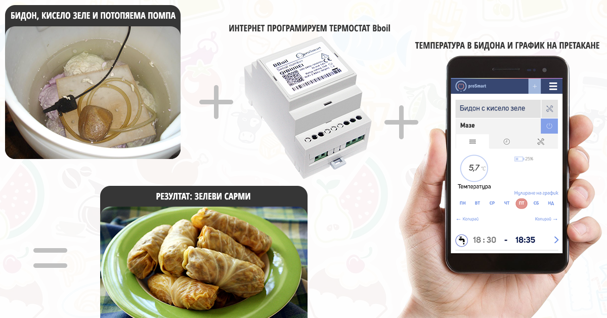 Така той може да наблюдава постоянно какво се случва с любимата на българите туршия, а системата осигурява автоматично поддържане на най-подходящата за зелето температура. Митков илюстрира технологията в проста диаграма: