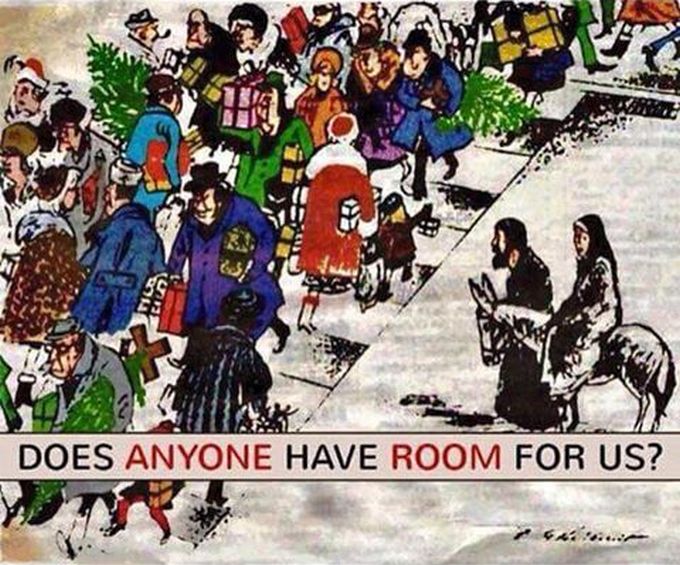 Имам една много любима коледна картинка – Светото семейство на Йосиф с бременната св. Богородица, което със смаяни погледи гледа „празнуващите” пазаруващи за Рождество. Забързани, добре облечени благочестиви християни са нарамили подаръци елхи, влачат превъзбудени дечурлига...