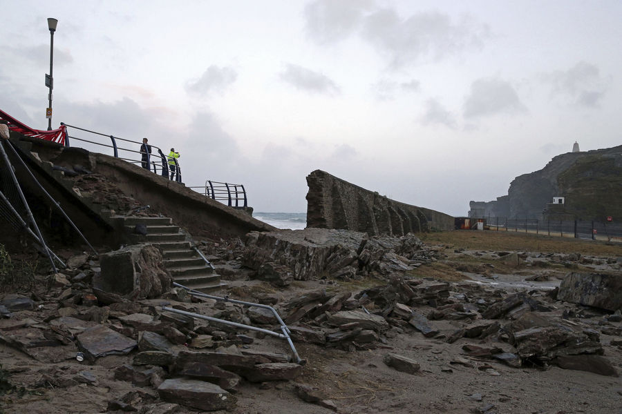 Много високи приливни вълни предизвикаха частично срутване на пристанищна стена в графство Корнуол, Югозападна Великобритания.