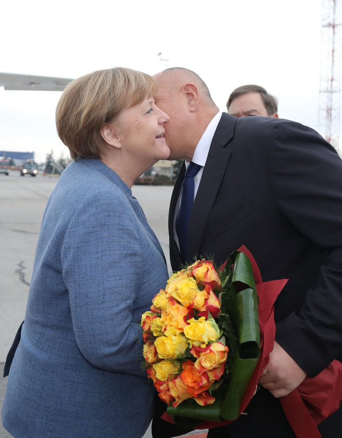 С тези ведри разяснения и букет жълти и червени рози българският премиер Бойко Борисов посрещна Ангела Меркел на правителствения ВИП в София.