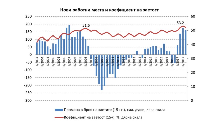 След експресната оценка за последното тримесечие, обаче, става по-малко вероятно икономиката да достигне 4%-ния растеж за цялата 2017 г. (2), както прогнозира МФ в актуализираната си средносрочна рамка. Този темп на експанзия на икономиката се случва на фона както на рекордно създаване на нови работни места, така и на рекордно висок коефициент на заетост. През 3-то и 4-то тримесечие на 2017 г. броят заети (15+) се увеличават съответно със 172 300 и 161 700 души на годишна база, което е съпоставимо с най-високите темпове на създаване на нова заетост от периода на предишния бум на трудовия пазар в края на 2006 и началото на 2007 г.