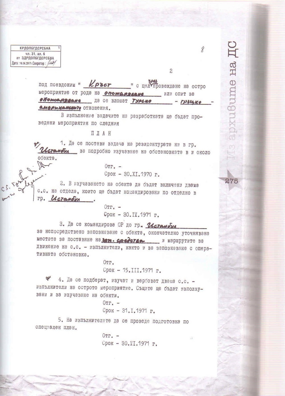 Следва и подробен план: до 30 ноември 1970 г. да се постави задача на резидентурата да разучи района; до 30 април 1971 г. да се включат и командироват двама секретни сътрудници; до 15 март 1971 г. на място да замине и оперативен работник за „окончателно уточняване на местата за поставяне на запалителни средства“; до 31 януари 1971 г. да се „подберат, изучат и вербоват двама секретни сътрудници за изпълнители“ и т.н.