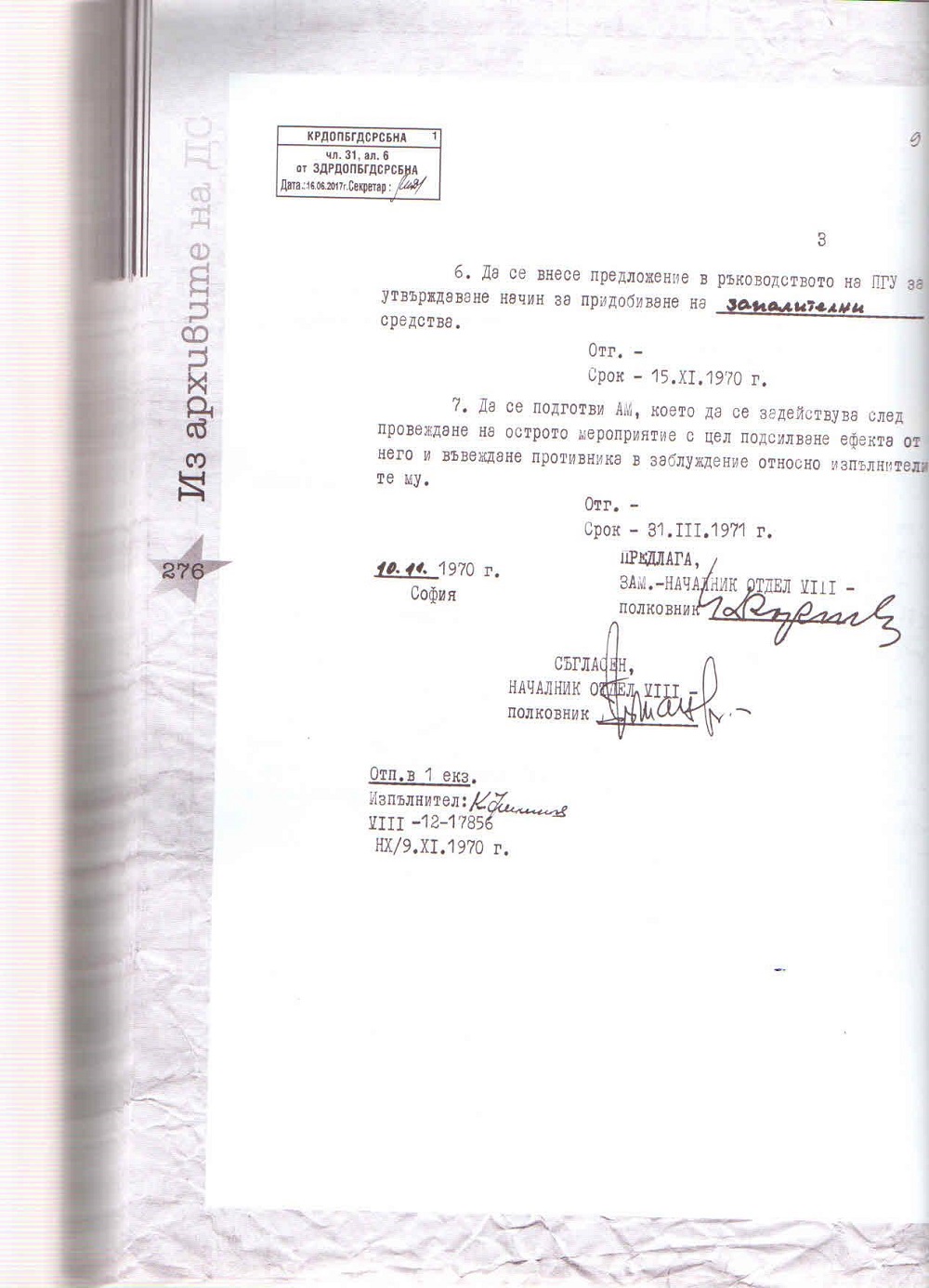 Държавна сигурност е предвиждала до 30 юни 1971 г. да е готов специалният план за изпълнение. Любопитно е, че много преди осъществяването на тези дейности ДС е трябвало вече да разполага със запалителните средства. Предложението за начин за придобиване на запалителни средства е трябвало да бъде готово до 15 ноември 1970 г.