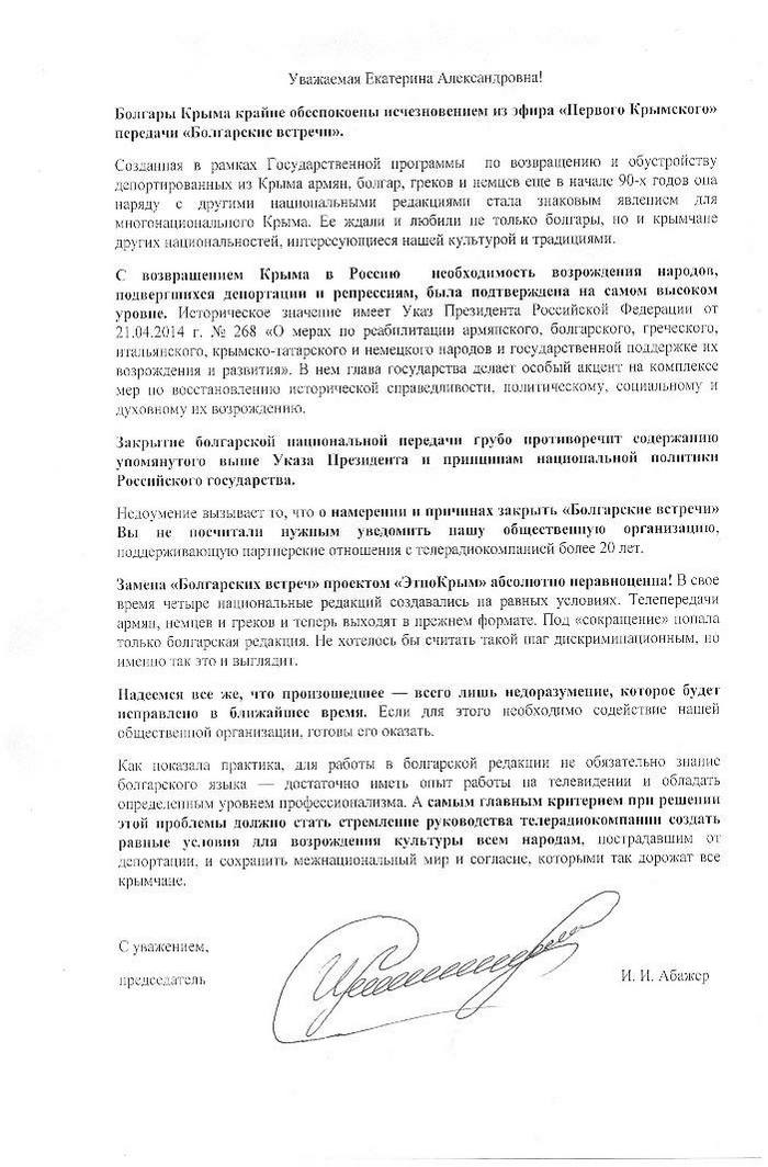 Абажер все пак е изпратил писмо до Екатерина Козир - директорката на Радиотелевизионната компания "Крим". В него се изтъква, че спирането на предаването за българите грубо противоречи на указа на руския президент Владимир Путин от април 2014 г. за реабилитирането на депортираните от Крим народи.