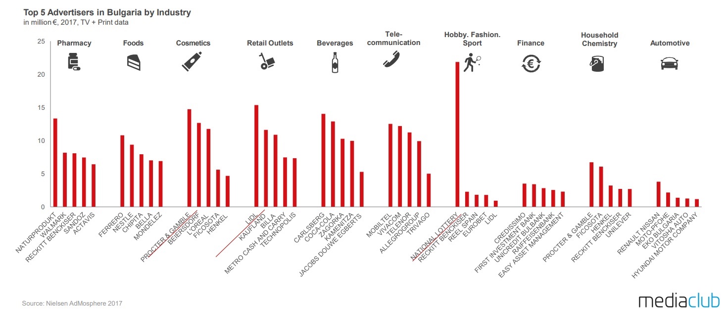 Рекламодател №1 на България не е от нито един от тези три бранша – на първо място излиза „Национална лотария“, която е платила за реклама в медиите почти 23 млн. евро през 2017 г. На второ и трето място са търговската верига „Лидл“ и производителят на козметика и препарати за почистване „Проктър и Гембъл“.