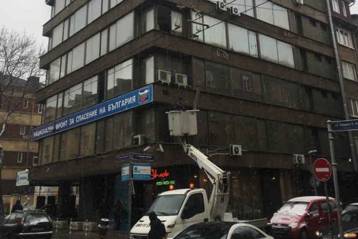Днес вече на "Раковски" 134 се вижда надпис "Национен фронт за спасение на България" и логото на партията на Симеонов, а кадърът очевидно е от процеса на ребрандиране на сградата.