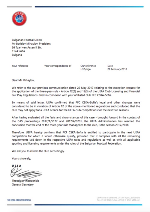 УЕФА потвърждава, че ПФК ЦСКА-София има право да участва в следващото издание на европейските клубни турнири, ако се класира по спортни резултати, отговаря на всички други изисквания, заложени в съответните правилници на УЕФА и покрие лицензионните изисквания на Българския футболен съюз. Моля, своевременно да уведомите клуба".