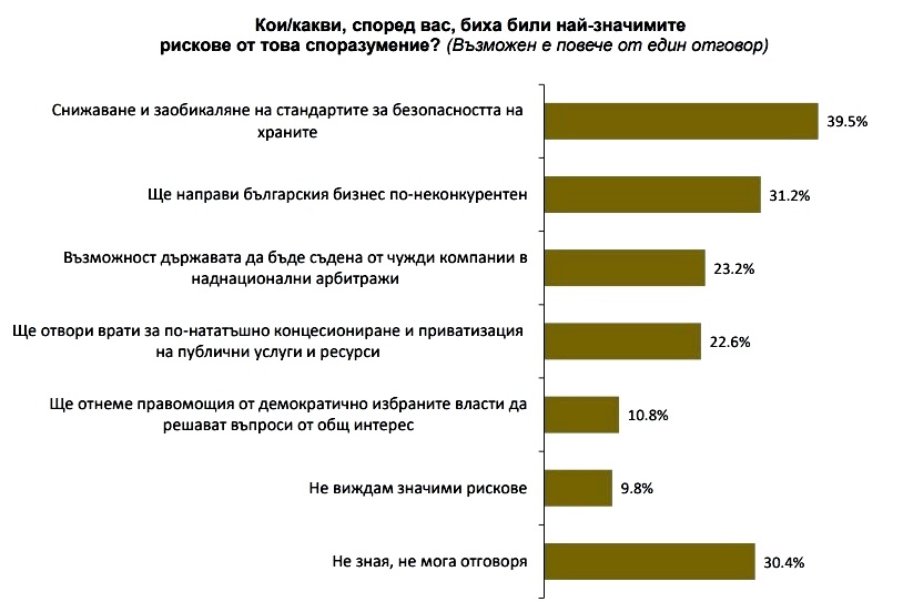 "Притесненията на гражданите се виждат и от отговорите на друг въпрос, от който става ясно, че само 9.8% от тях не виждат значими рискове. Основните притеснения на българина са свързани със снижаване и заобикаляне на стандартите за безопасност на храните (39.5%), намаляване на конкурентността на българския бизнес и възможността държавата да бъде съдена от чужди компании в наднационални арбитражи (23.2%) като при този въпрос гражданите са могли да дават повече от един отговор.