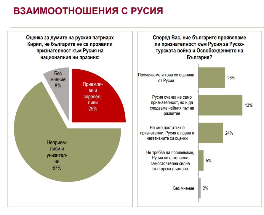 67% оценяват думите на патриах Кирил, че българите не са проявили признателност към Русия, като неприемливи и унизителни. 25% ги приемат за приемливи и справедливи. 43% са на мнение, че Русия настоява не просто за признателност, каквато мнозинството от хората наистина проявяват, но и страната ни да следва нейния път на развитие. Което, също според мнозинството от българите, не съответства на техния избор.