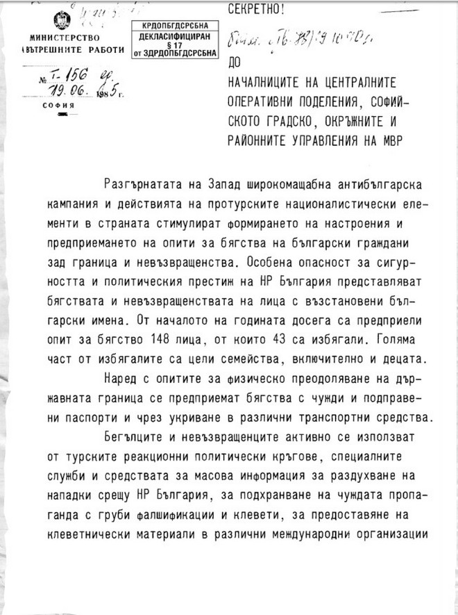 "Това налага органите на МВР да вземат допълнителни мерки за подобряване на работата по охраната на държавната граница и недопускане на бягства и невъзрващенства, особено на лица с възстановени български имена, които могат да затруднят външнополитическата дейност на НРБ и политиката на партията за национално осъзнаване на потомците на насилствено потурчените в миналото българи."
