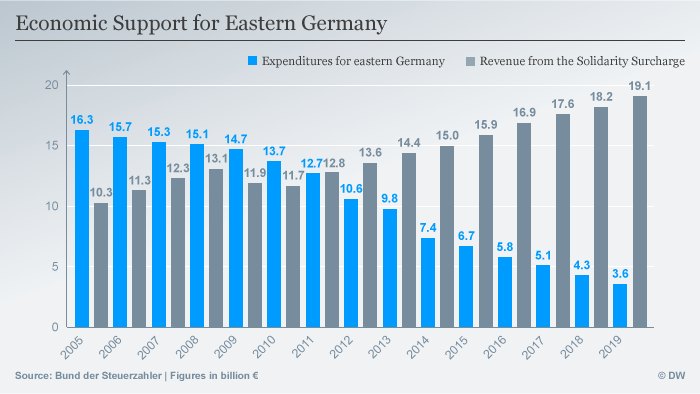 В предизборната си кампания от м.г. за четвърти канцлерски мандат Меркел обеща да премахне т.нар. данък солидарност. Чрез него се прехвърляха средства на Изток от по-богатите провинции. Сегашното правителство в Берлин се е съсредоточило върху това да пренасочва средства в помощ на изпитващи затруднения райони, без значение дали са на изток или запад.