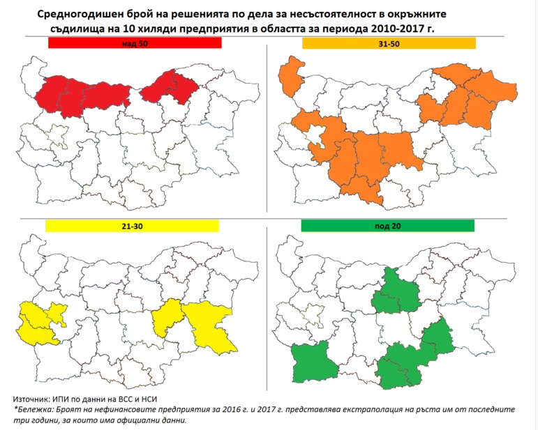 Картата на страната по средногодишен брой на решенията по дела за несъстоятелност на 10 хиляди нефинансови предприятия за периода 2010-2017 г. показва известна клъстеризация на областите, т.е. струпване на делата в определени области.