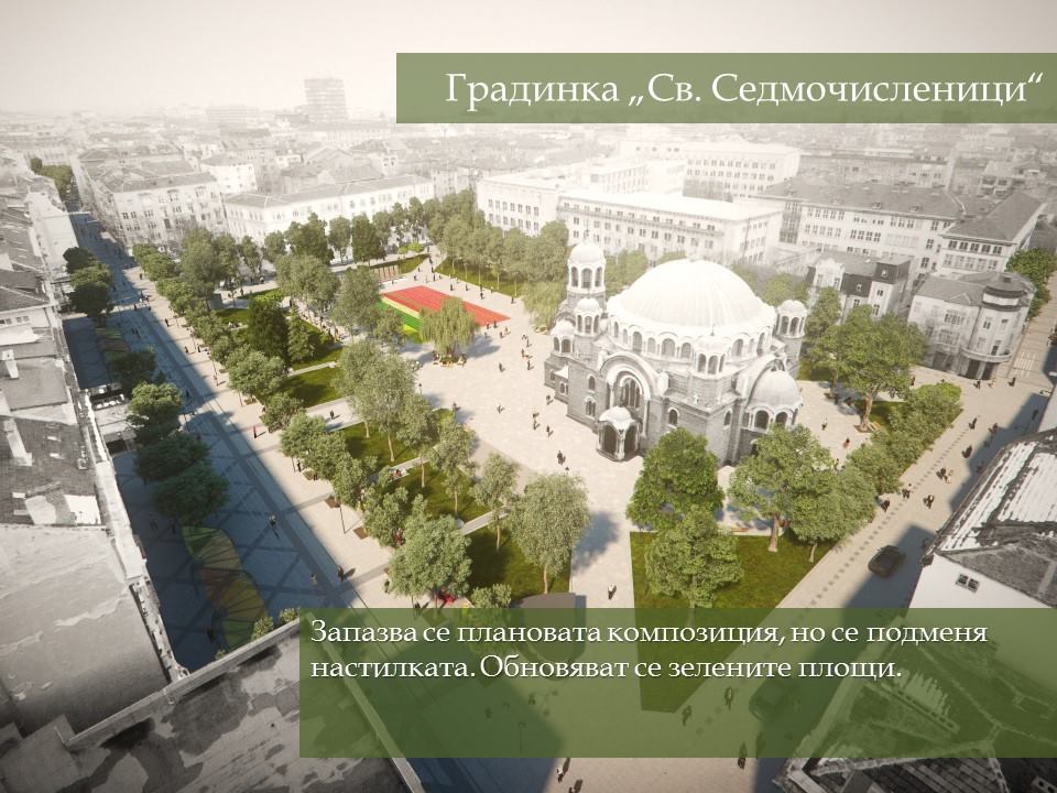 Настилките по ул. „Граф Игнатиев“, пл. „Славейков“, пл. „Гарибалди“, градината пред църквата „Свети Седмочисленици“ ще бъдат изцяло подменени. Настилките ще бъдат комбинация на гранитни павета и бетонови с много високи заложени характеристики на здравина.