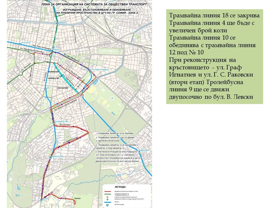 За времето на ремонта трамваите по ул. „Граф Игнатиев“ ще бъдат спрени и ще се резкрие временна автобусна линия, която ще се движи по ул. „Гурко“.