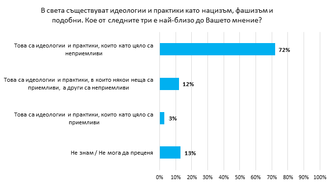 Конкретните резултати на "Галъп Интернешънъл" - 72 % от българите смята за "неприемливи като цяло" фашизма, нацизма и подобните му, 12 на сто - приемат "някои неща" от изброените идеологии и практики, а други смятат за неприемливи. 3% от бърлгарите намират за "изляло приемливи" фашизма и нацизма.
