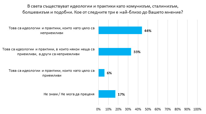 Данните показват, че по-малко от половината българи смятат за напълно неприемливи сталинизма, болшевизма и комунизма - 44 на сто са на това мнение. Цели 33 % обаче твърдят, че в трите вида тоталитарни идеологи и и практики има и "приемливи" неща, и "неприемливи". А други 6 % от българите откровено приемат сталинизма, болшевизма и комунизма.
