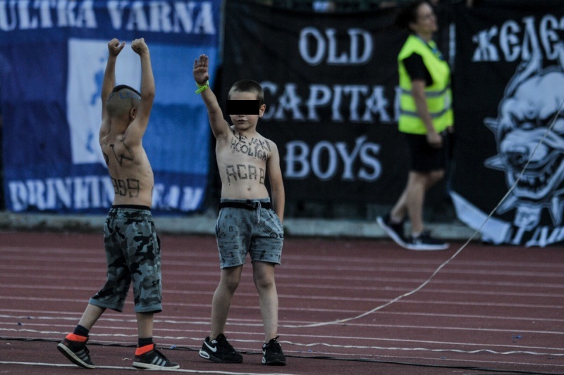 Та... На едната снимка (горе) се виждат две невръстни деца, които са на пистата на стадион "Васил Левски" пред сектор "Б". По телата им четем следните надписи: ACAB (All Cops Are Basterds, или "Всички ченгета са копелета"), Levski Hooligan, SW 1999 ("София Запад" - прочутата крайна запалянковска фракция на "Левски" с годината на създаването й)...