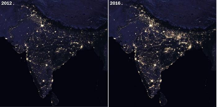 В резултат увеличаването на нощното осветление като цяло е свързано с нарастването на БВП. Това може да бъде видяно в следните нощни снимки на Индия, направени от американската космическа агенция НАСА през 2012 и 2016 г. За този период икономическата продукция в страната се е увеличила от 1,9 трилиона на 2,3 трилиона долара.