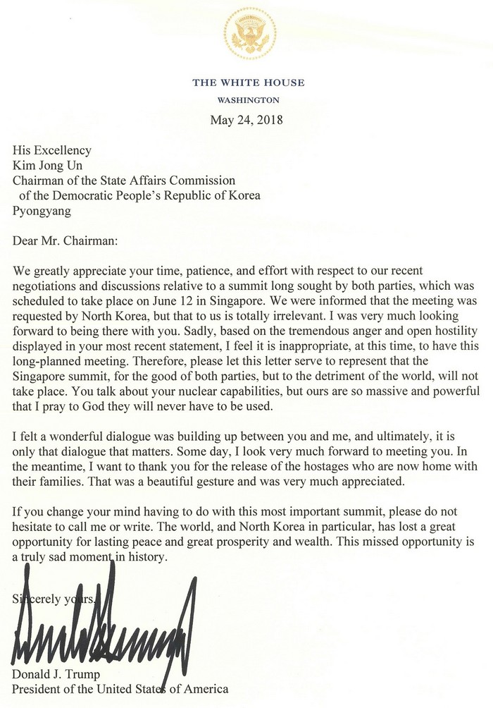 "Ако промените мнението си, свързано с тази най-важна среща на върха, моля не се колебайте да ми се обадите или пишете. Светът и по-специално Северна Корея загуби чудесна възможност за траен мир и голям просперитет и богатство".