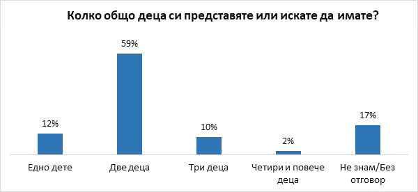 Според резултатите младите хора у нас масово си представят, че ако изградят семейство, то броят на децата в него ще бъде ограничен до две. 59 на сто са посочили тази цифра. 12% си представят едно дете, 10% - три, а едва 2 на сто искат да имат четири или повече наследници.