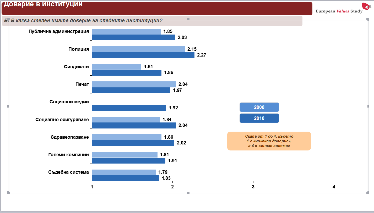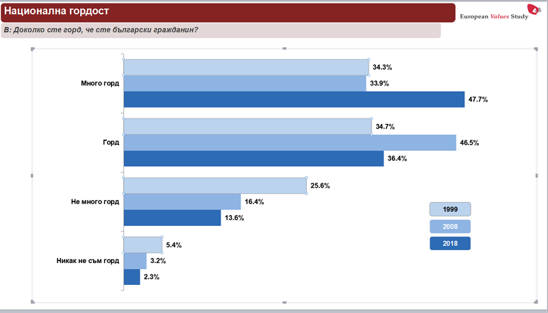 Това показват данните от Петата вълна на европейското изследване на ценностите, което отчита промените в нагласите в период от 10 години. То се извършва всяко десетилетие, за да се видят как се променят ценностните оценки на европейците. Проучването се извършва в България за четвърти път. То е осъществено от "Алфа рисърч" сред 1560 души в периода между 11 ноември 2017 г. и 9 януари 2018 г. Партньор в поручването от българска страна е Нов български университет. Европейското изследване обхваща 47 страни, днес бяха представени данните за България, както и коментирани от политолози, социолози, култоролози, икономисти, антрополози.