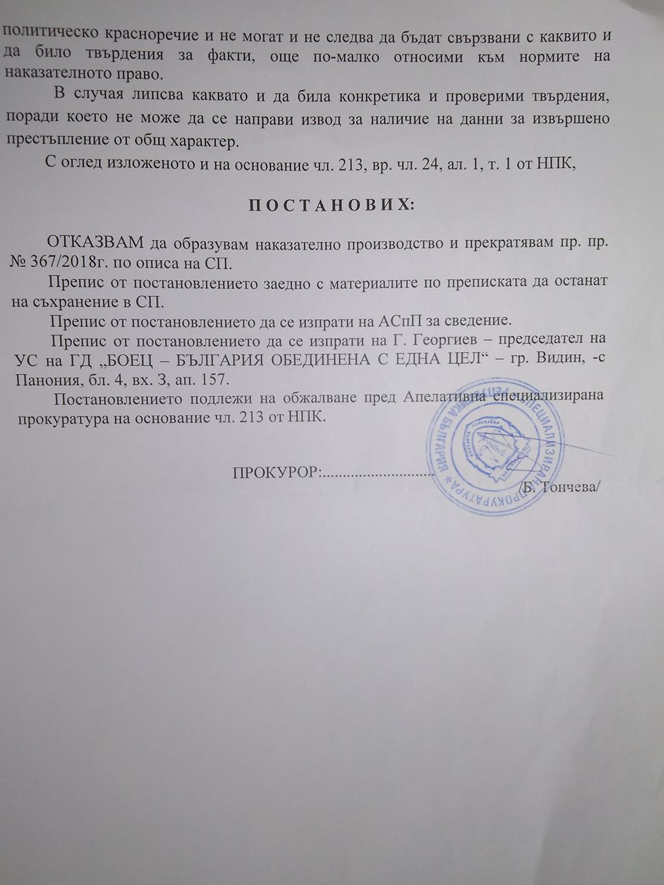 Постановлението на Специализираната прокуратура: