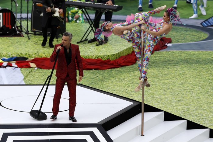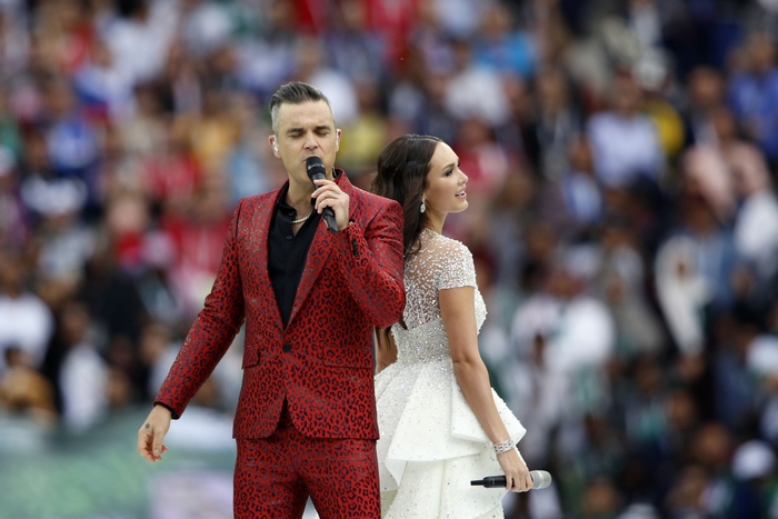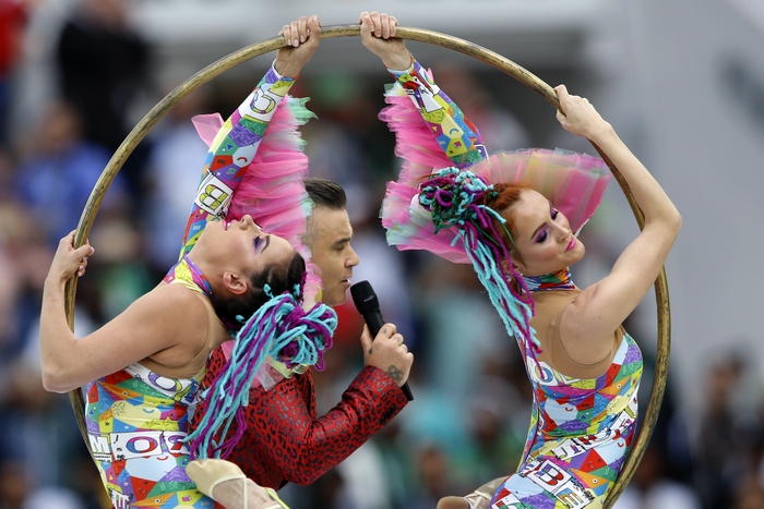 Роби Уилямс показа среден пръст по време на откриването на Световното на стадион "Лужники" в Москва и това привлече вниманието за сметка на прекрасната и стегната церемония, на която поп звездата пя сам и с оперната звезда Аида Гарифулина.