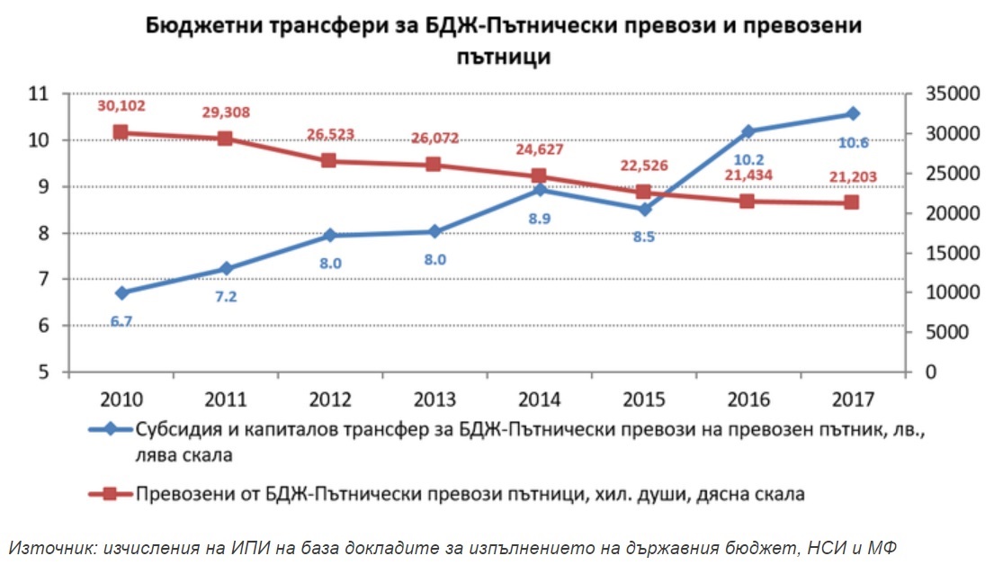 Графиката по-горе ясно показва бързия спад на пътниците, като от 2010 г. насам намалението е с близо 10 000 души, или около 1/3. Така държавният трансфер за "БДЖ-Пътнически превози" на превозен пътник постоянно расте и от около 7 лева през 2010-2011 г. вече надхвърля 10 лева. БДЖ се превръща в едно все по-скъпо удоволствие за част от населението, което се плаща от останалата част от населението.