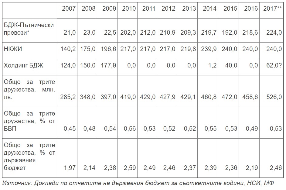 **Данните за 2017 г. са на база одобрения от НС държавен бюджет и съобщения в медиите от лятото на 2017 г. за отпуснатата помощ на холдинг БДЖ.