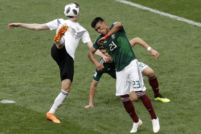 През цялото първо полувреме Мексико бе по-активния отбор и определено превъзхождаше актуалния световен шампион. "Ацтеките" пропуснаха много положения, като с най-голям пропуск се отличи Чичарито в 21-ата минута. Малко след гола германците получиха право да изпълнят пряк свободен удар. Тони Кроос показа майсторство, но топката се отби в гредата, след като бе отразена от вратаря на Мексико.