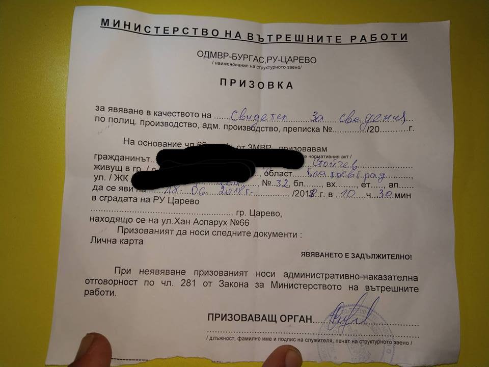 Освен това лицето Стойчев е призовано да се яви в районното управление в Царево в качеството на "свидетел за сведения" днес, 18 юни.