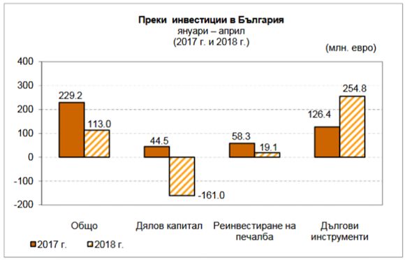 За първите 4 месеца на годината преките чуждестранни инвестиции (ПЧИ) в България са 113 милиона евро, което е спад с 50.6% на годишна база - спрямо януари-април 2017 г., показват данните на БНБ. Миналата година те са били 229.2 милиона евро.