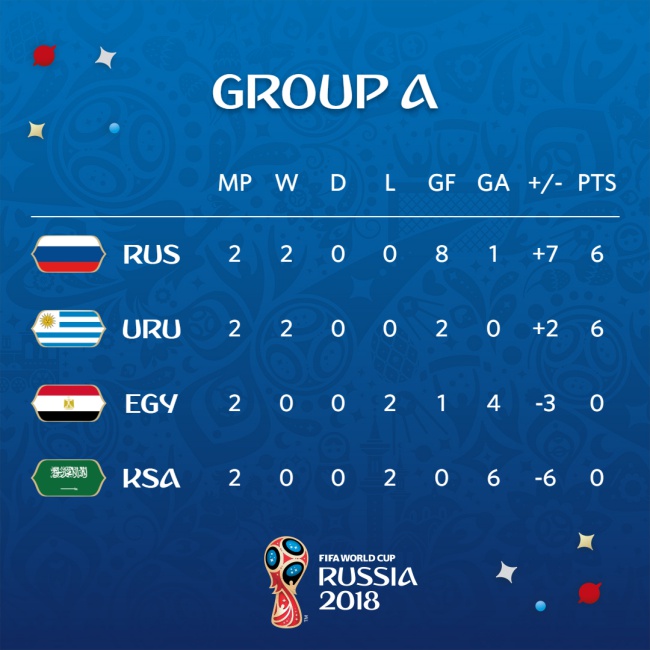 Така след вторите срещи в група А домакините и латиноамериканците имат по 6 точки, като головата им разлика е съответно 8:1 и 2:0. На 25 юни двата тима ще определят кой ще е първи и кой втори, което не е маловажно предвид това, че съперници в първата фаза на елиминациите най-вероятно ще бъдат Португалия и Испания.