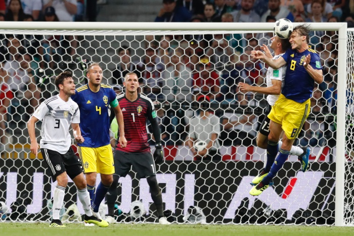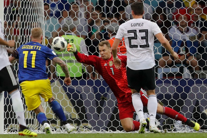 "Маншафтът" започна активно, както и срещу Мексико, а още в началото Марко Ройс и Юлиан Дракслер изтърваха отблизо, топката беше избита от голлинията. Натискът продължи, но постепенно шведите почнаха да правят това, което и Мексико - контраатаки. Маркус Берг изскочи сам срещу Мануел Нойер и беше побутнат от Боатенг, точно когато пробва да стреля.
