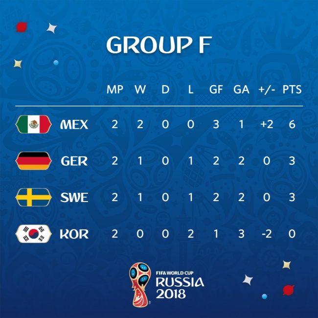 Така Мексико има 6 точки, Германия и Швеция са с по 3, а Южна Корея - 0. В последния кръг на 27 юни от 17:00 часа мачовете са Германия - Южна Корея и Мексико - Швеция. Световните шампиони държат съдбата си в собствените ръце. Дори при равенство щяха да бъдат зависими от другата среща, а загуба щеше да ги изхвърли още днес.