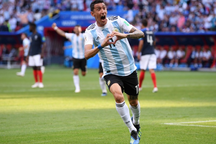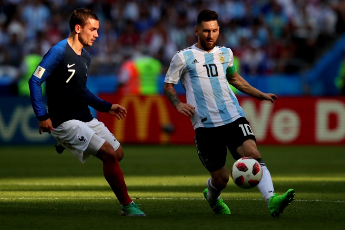 "Сините" започнаха много по-добре. В началото Антоан Гризман удари напречната греда от пряк свободен удар. В 12-ата минута Мбапе принуди "гаучосите" да го гонят през целия терен, а накрая Маркос Рохо го събори в пеналта. Дузпа, реализирана с лекота от Гризман.