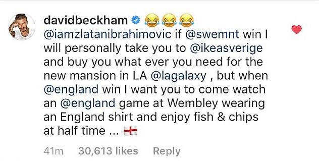 "Йо, Дейвид Бекъм, ако Англия победи ще те заведя на вечеря където поискаш. Но ако Швеция спечели, ти ще ми купиш каквото поискам от ИКЕА. ОК?"