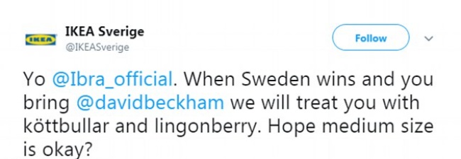 "Йо, Ибра, когато Швеция победи и ти доведеш Дейвид Бекъм, ние ще те нагостим с кюфтета (kottbullar, бел. ред.) и червени боровинки. Средна порция ОК ли е?"