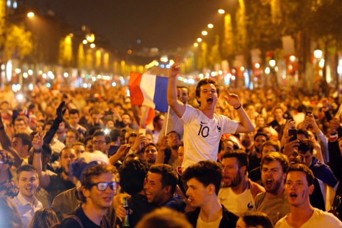 Море от хора заля парижкия булевард "Шан-з-Елизе" след победата на Франция над Белгия с 1:0 на първия полуфинал на Световното. Тимът на селекционера Дидие Дешан ще спори за титлата в неделя, а днес ще научи своя съперник.