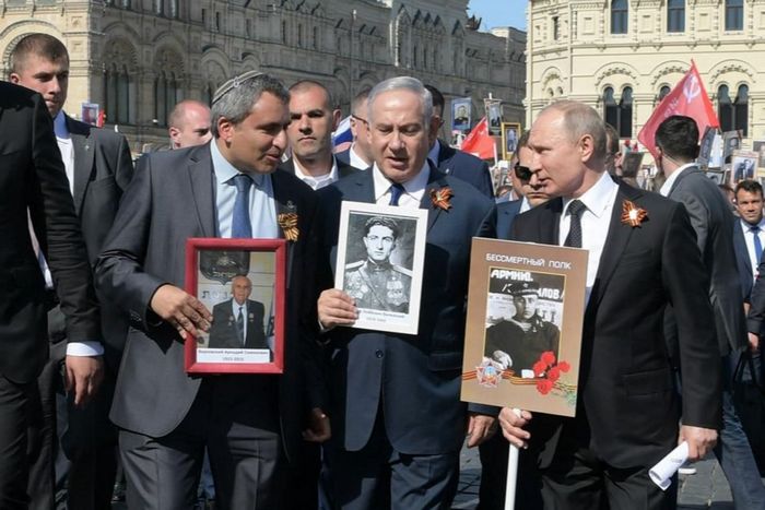 Военният парад отстъпи място и на акцията “Безсмъртен полк”. Десетки хиляди руснаци преминаха пред стените на Кремъл с портрети на свои предци, служили в Червената армия и участвали във Втората световна война. Към акцията се присъедини и Владимир Путин, който насеше снимка на баща си. Но изненадващият почетен гост не беше руският президент, а Бенямин Нетаняху.