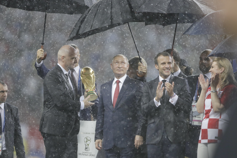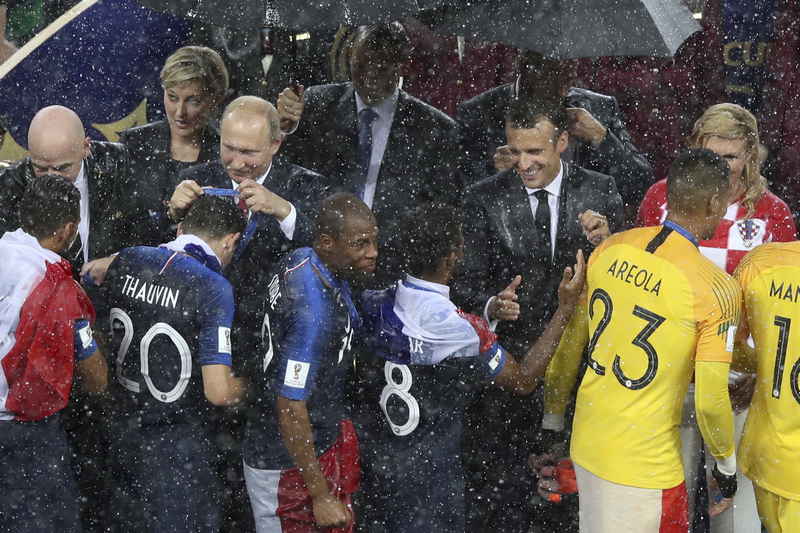 Конфузна ситуация се получи, след като над руския президент Владимир Путин се материализира чадър в мига, в който заваля силно дъжд. За колегите му Макрон и Колинда Грабар-Китарович предпазните средства се появиха доста по-късно. Двамата бяха мокри до кости, но това видимо не помрачи доброто им настроение.