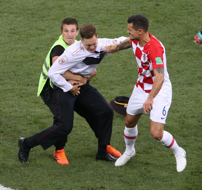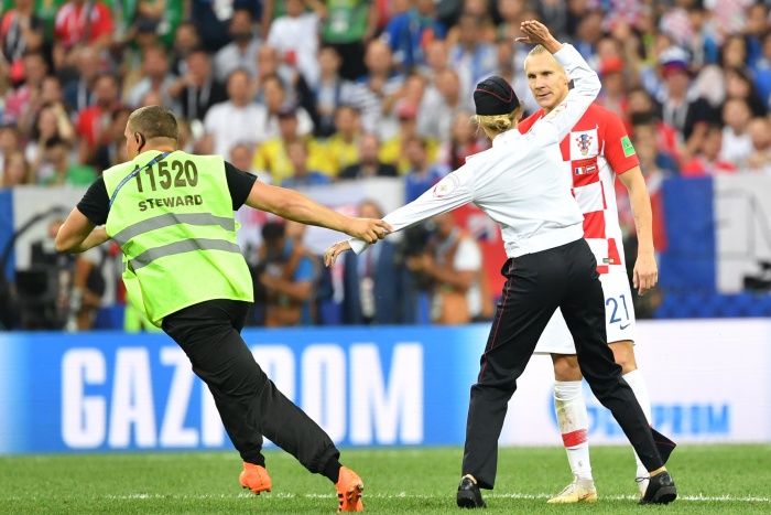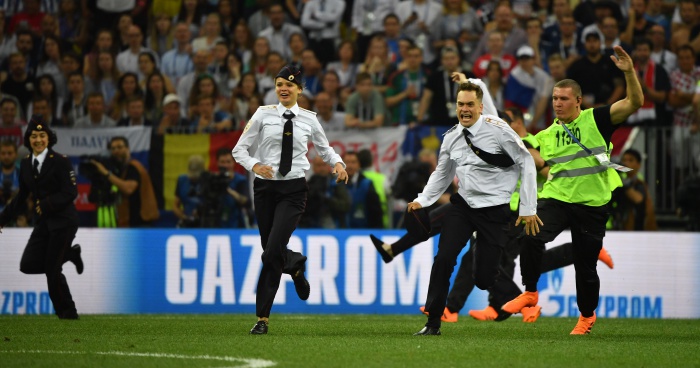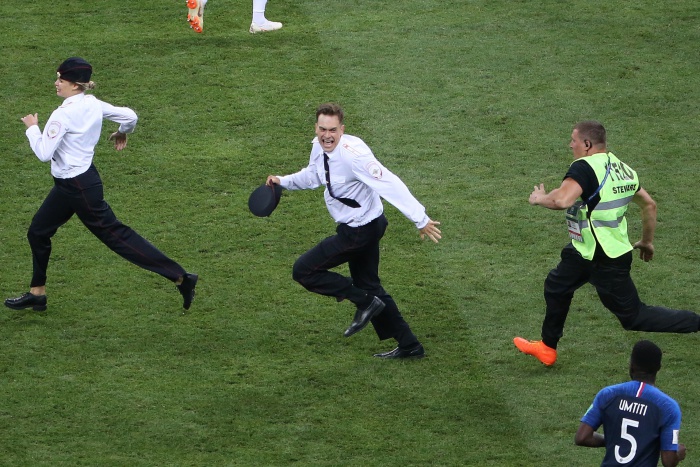 В 52-ата минута на финала на Световното Франция - Хърватия (4:2) на терена на "Лужники" нахлуха четирима зрители, поради което мачът бе спрян. Стюарди моментално влязоха на игрището и бързо изведоха (в някои случаи изнесоха) тичащите протестъри, облечени с полицейски униформи.