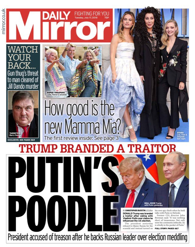 Путин трябва да мърка от удовлетворение заради това, че неговият пудел разбива американската република отвътре, приемайки за истина думите на бившия агент на КГБ, а не доказателствата на ФБР. Лъжите на Тръмп, неговите измислици, глупост, инат и отричане на неудобните факти са повече от пародийни. Най-доброто, което може да се каже за президента, е, че той е наивен, че не може приеме истината, независимо от това, че така прилича на имбецил. Бизнесменът в Белия дом е национално унижение. Той е сбъднатата мечта на Путин и най-големият кошмар за Америка, пише "Мирър".
