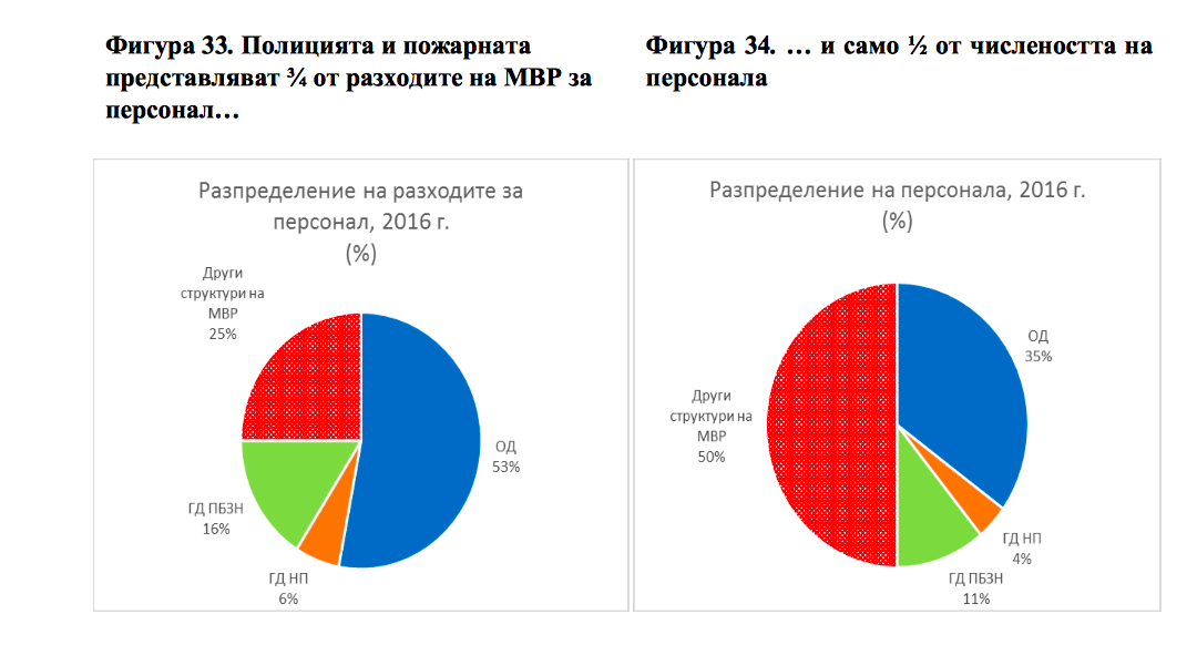 "МВР, с численост на персонала от 45 6374, е най-големият работодател в страната, а 8 778-те души персонал с функции на обща и специализирана администрация надхвърля общия брой служители в централната администрация на всички министерства5. Общата и специализирана администрация на МВР представлява 19% от общия брой на служителите и включва и персонал, който се занимава с предоставянето на специфични услуги, например издаване на документи за самоличност (75), администриране на спешни повиквания на единния европейски номер 112 (471), гранична полиция (968) и други, които не са обект на настоящия анализ. Администрацията изглежда прекалено голяма и следва да бъде анализирана допълнително, за да се идентифицират потенциални възможности за повишаване на ефикасността."