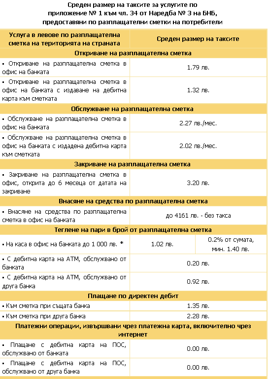 За случаите, при които банката автоматично разплаща от сметката на клиента задължения за ток, вода, парно, интернет и телефон, средните такси са доста високи – 1.35 лв., ако сметката на комуналния доставчик е в същата банка, и 2.28 лева, ако сметката е в друга банка.