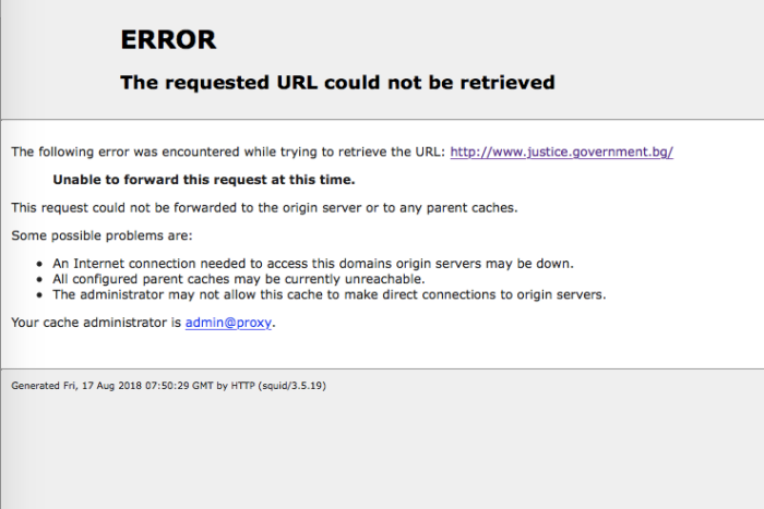 В петък сутринта интернет страницата на институцията даваше грешка. На екрана се изписваше съобщение, че сайтът не е достъпен, както и че възможните причини за това са прекъсване на интернет връзката към сървъра, на който е домейнът, липса на достъп до сървърите или ограничен такъв от администраторите.