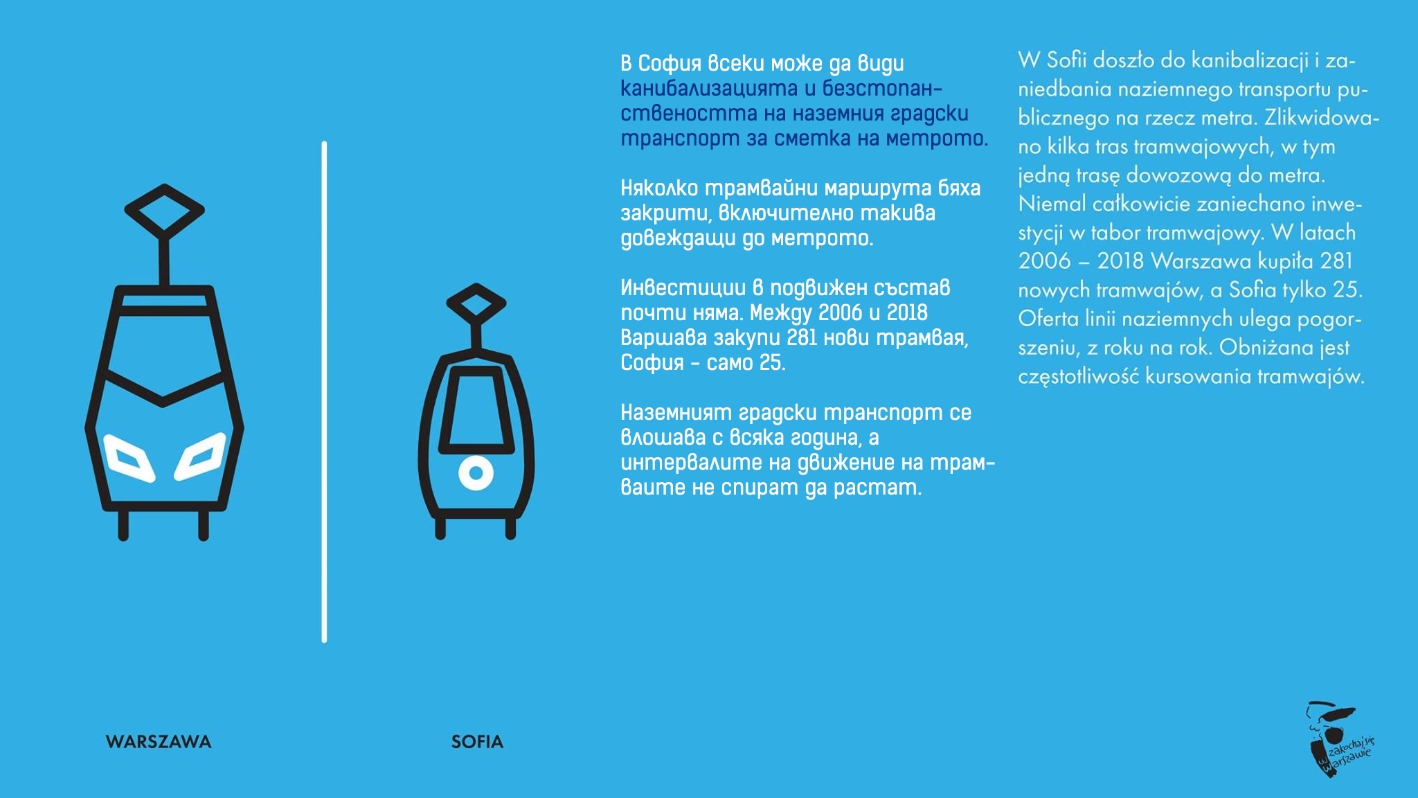 В презентацията си г-жа Казновска описва същите притеснителни данни, за които Спаси София говори от години. В София броят на новите трамваи е десетократно по-малък от купените от Варшава и има “канибализация и безстопанственост на наземния градски транспорт за сметка на метрото”.